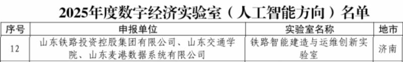 日前,山東省工業(yè)和信息化廳公布了2025年度山東數(shù)字經(jīng)濟(jì)創(chuàng)新平臺(tái)名單,集團(tuán)牽頭申報(bào)的“鐵路智能建造與運(yùn)維創(chuàng)新實(shí)驗(yàn)室(人工智能方向)”成功入選,成為本次25家獲批單位之一,標(biāo)志著集團(tuán)在人工智能關(guān)鍵技術(shù)研究與創(chuàng)新應(yīng)用方面邁出了堅(jiān)實(shí)一步。