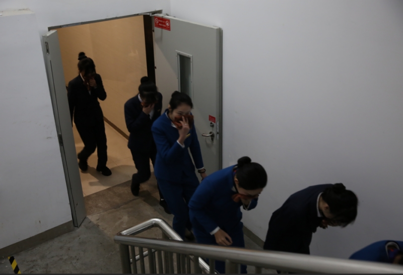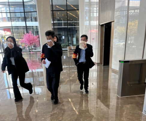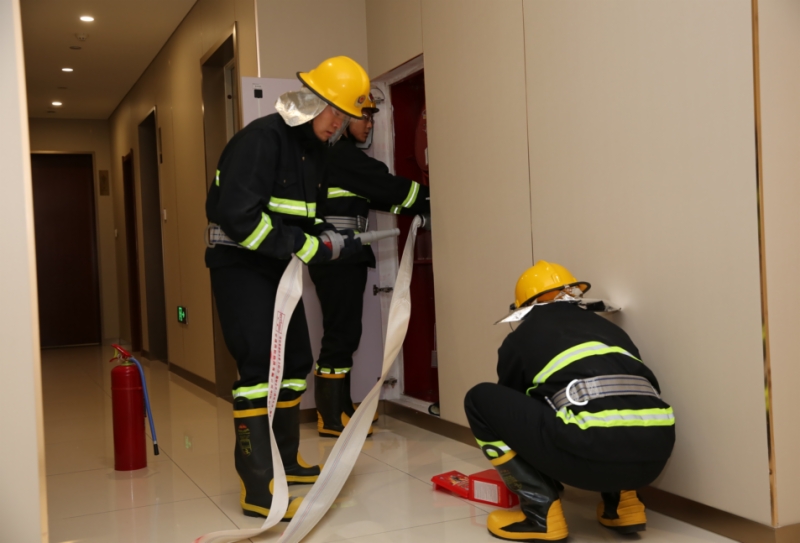 本次演練以2520會議室為模擬著火點,中控室收到煙感報警后,工作人員迅速確認(rèn)火情,現(xiàn)場指揮立即啟動應(yīng)急預(yù)案。滅火組快速穿戴消防服趕赴火場,利用滅火器、消防水帶撲救初期火災(zāi);設(shè)備組同步將全部電梯迫降至1樓,保障疏散安全;疏散組按照“向下疏散、應(yīng)下盡下”原則,引導(dǎo)人員用濕毛巾捂住口鼻,沿指定樓梯有序撤離,身體不適人員按樓層就近疏散至避難層;警戒組、救護(hù)組分別做好現(xiàn)場警戒與應(yīng)急救護(hù)準(zhǔn)備。