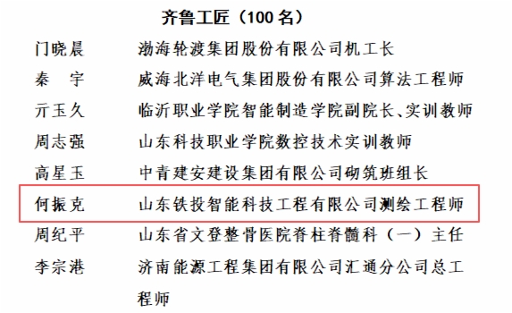 近日,山東省總工會(huì)發(fā)布了2025年齊魯大工匠、齊魯工匠、山東手造大工匠、山東手造工匠名單,山東鐵投智能科技工程有限公司何振克獲“2025年度齊魯工匠”榮譽(yù)稱號(hào)。