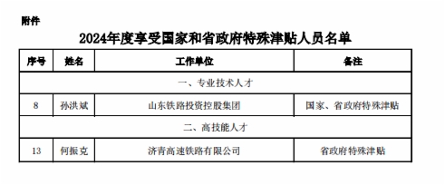 近日,山東省人力資源和社會(huì)保障廳公布2024年度享受?chē)?guó)家和省政府特殊津貼人員名單,山東鐵投集團(tuán)總經(jīng)理助理孫洪斌入選享受?chē)?guó)家特殊津貼、省政府特殊津貼名單,山東鐵投智能科技工程有限公司(申報(bào)時(shí)就職濟(jì)青高速鐵路有限公司)何振克入選享受省政府特殊津貼名單。